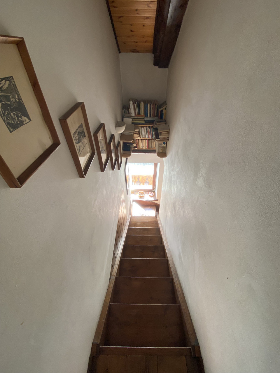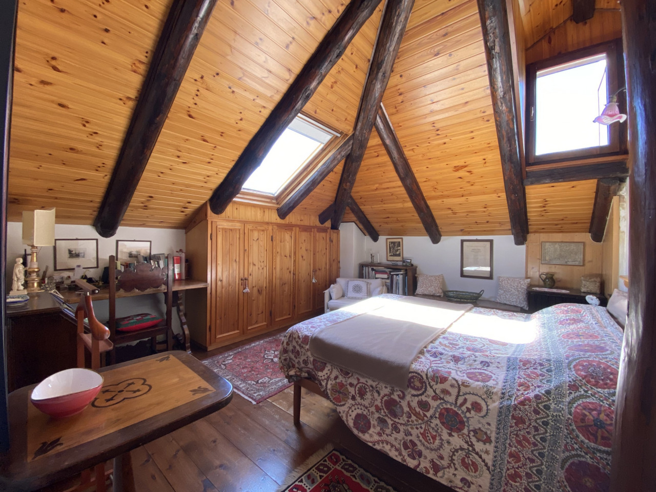 The internal staircase leads to the sleeping area which includes a spacious double bedroom and a bathroom. Each room in the apartment features wooden floors and ceilings with exposed beams that enhance the mountain character of the property.